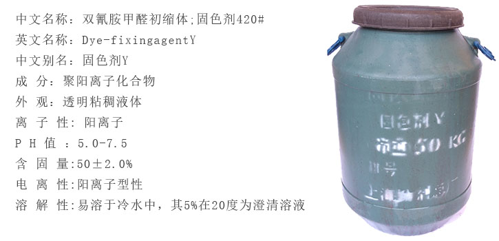 固色劑Y穩定性: 遇硬水、強酸、強堿、丹甯酸、雕白塊以及大量硫酸鹽,次㊙️氯🧛🏽酸鹽等會産生沉澱。
