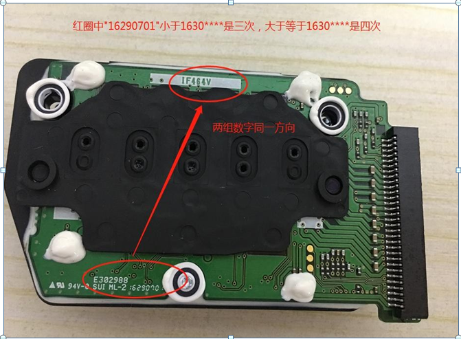 2、數碼印花機噴頭中186 三次四次打印頭區分方法:拆開數碼印花機打印頭電路闆,紅圈圈住位置 在兩組數👩🍼字同一方向的前提下,數字編碼小于 1630****是 186三次💫,大于等于 1630****是 186四次打印頭。其中一種特殊情況:(維修站訂貨包裝标号FA24000 是🛌🏻 186 三次)