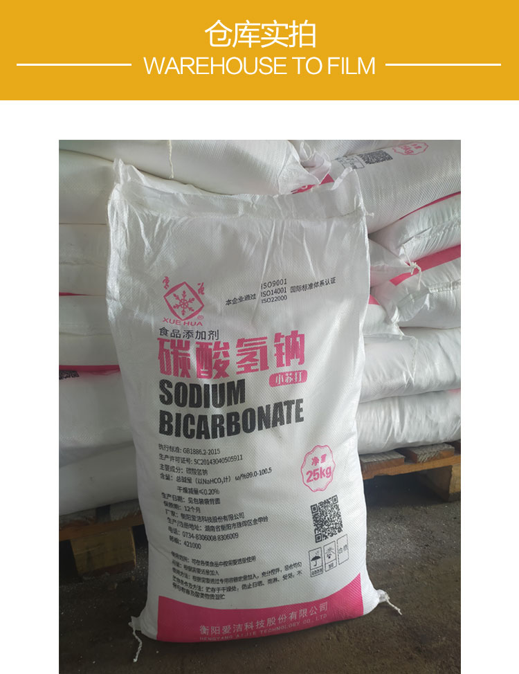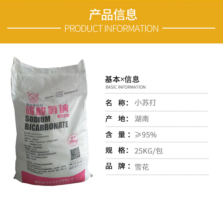 雪花食品級小蘇打 的化學名稱叫碳酸氫鈉,經常用它當發酵粉做饅頭🔞、餅幹等食品添加劑。食品級小蘇打主要用于食品、飲料汽水和🏃🏿♀️➡️冷飲中二氧化碳的發生劑。
